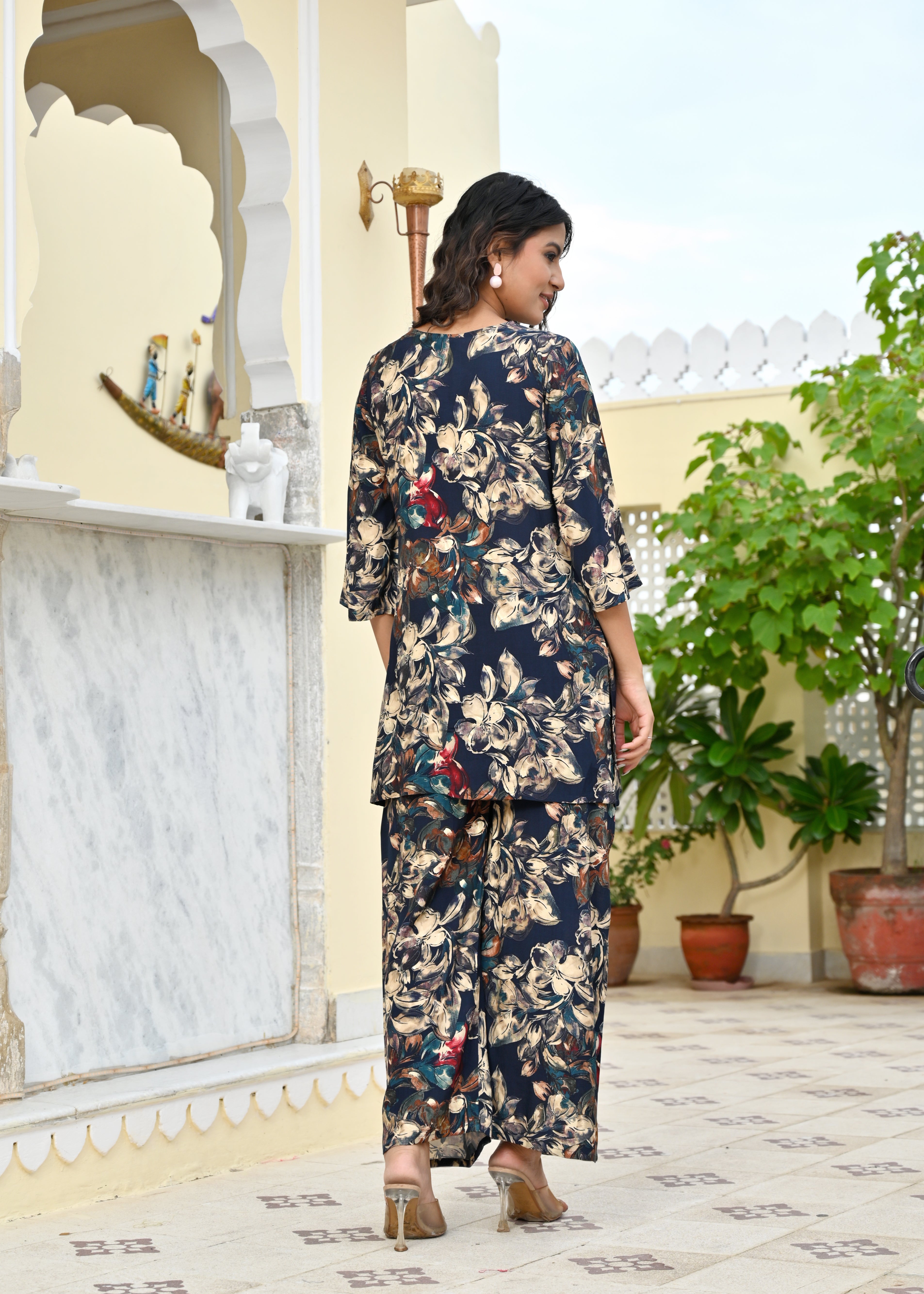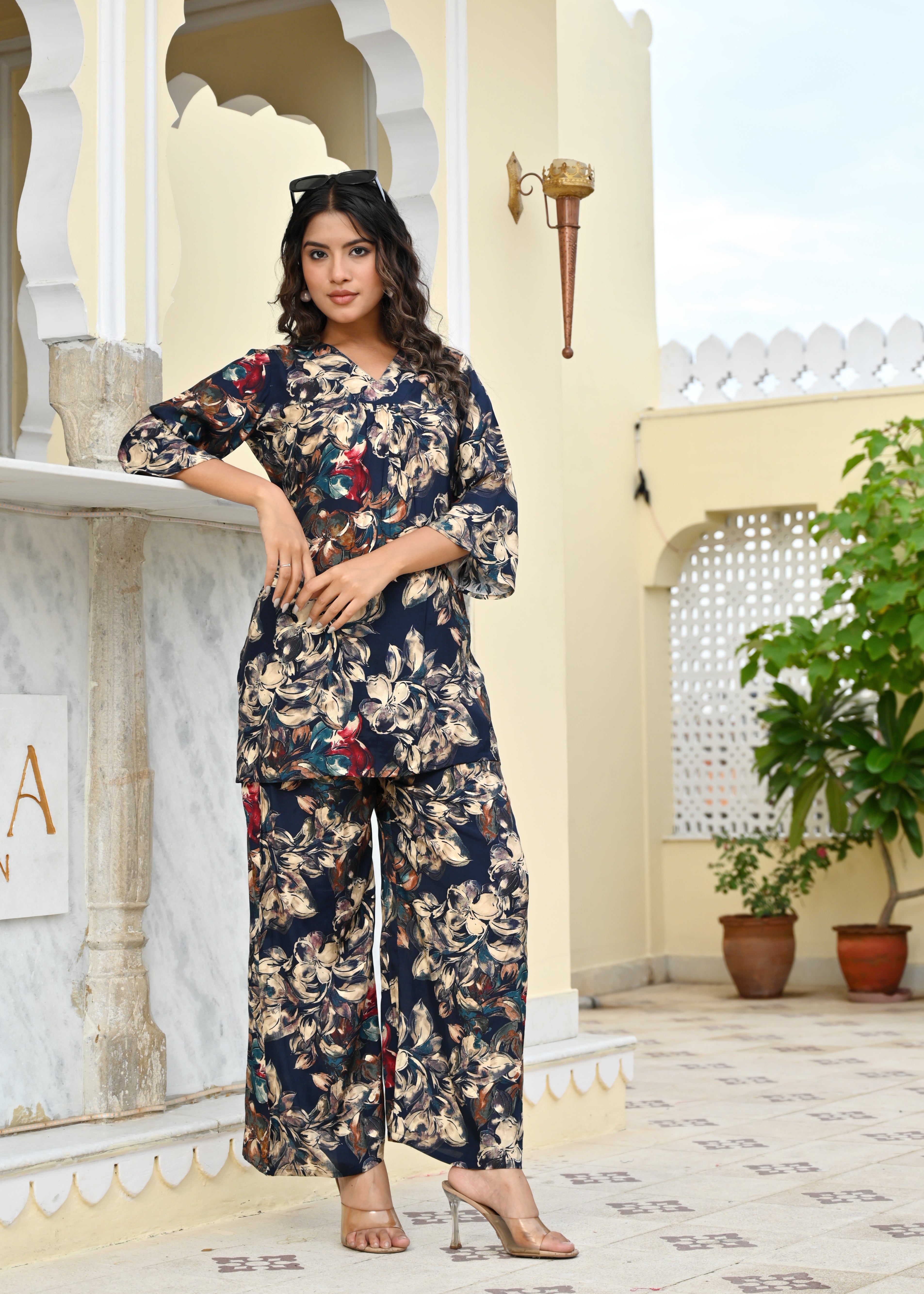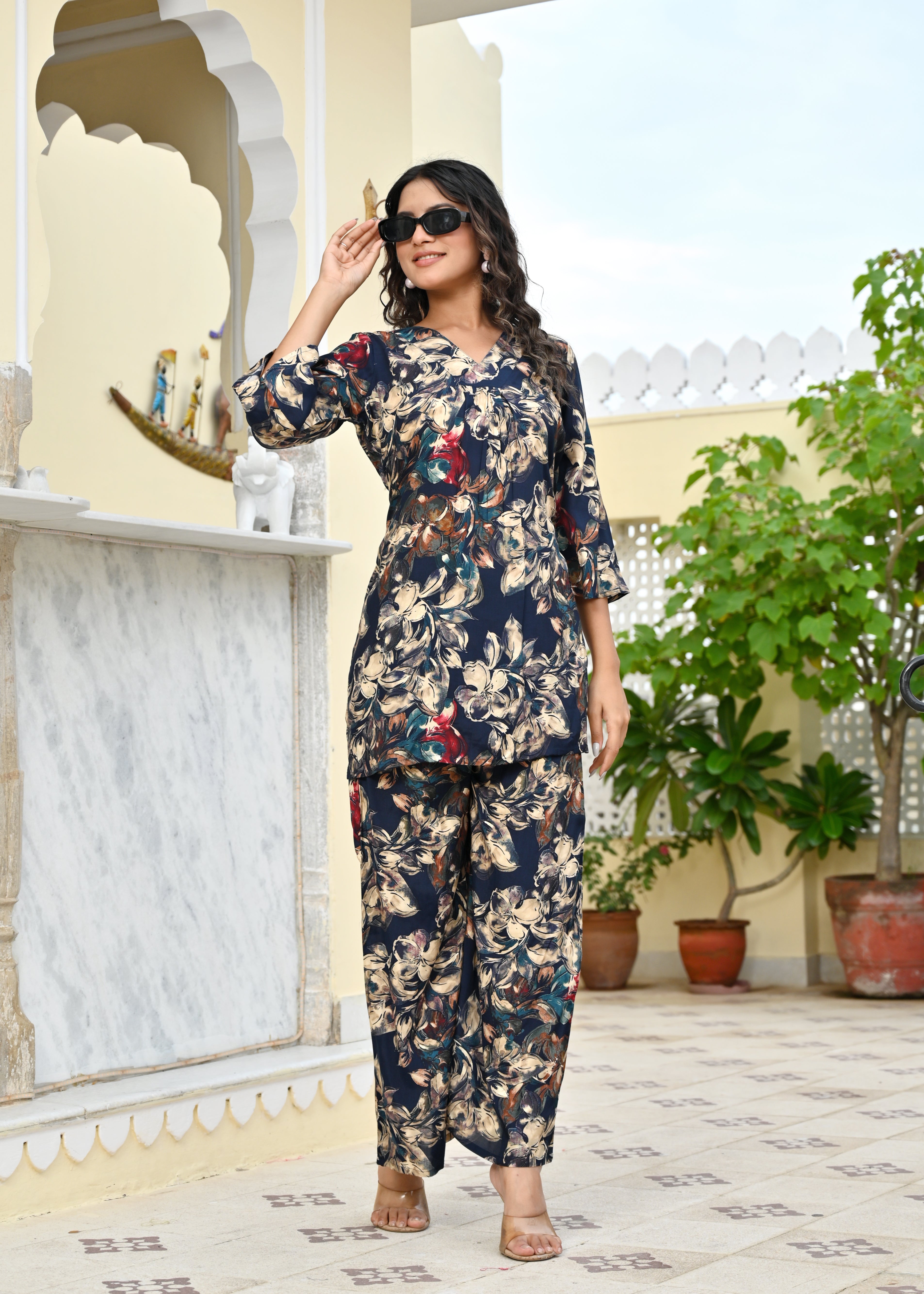 Step into timeless elegance with Belveera’s Navy Floral Co-ord Set, designed for the modern woman who loves comfort with style. Crafted from premium pure viscose fabric, this co-ord set features a rich navy base adorned with delicate floral prints that add a touch of femininity and charm. The coordinated top and bottom offer a relaxed yet flattering fit, perfect for brunches, casual outings, or festive get-togethers. Soft, breathable, and effortlessly chic — this versatile ensemble makes everyday dressing simple yet stylish.